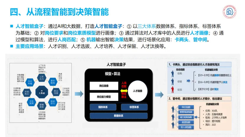 举个例子,我们的人才智能盒子,这可能像是一个黑盒子。但在这个黑盒子的左边,是我们企业各个部门产生的数据,无论是人力资源、财务、营销还是商务。我们把这些数据放入盒子,经过处理,就能得到右边的各项指标。这些指标,可以帮助我们分析场景,进行场景化的应用。